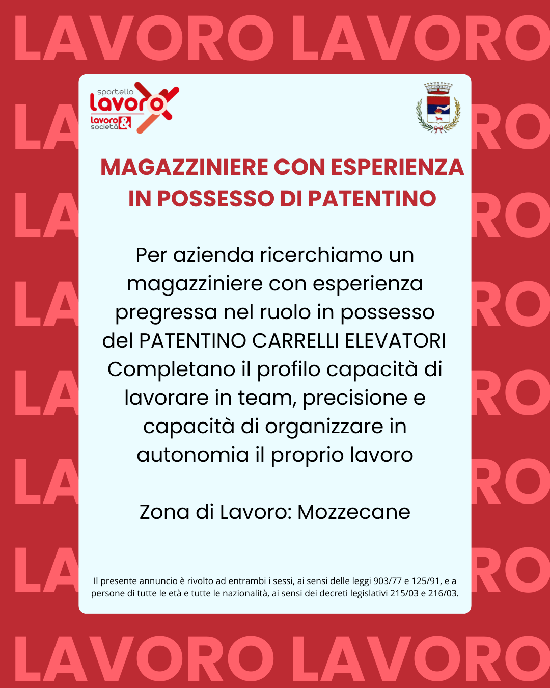 Lo Sportello LAVORO riparte! Gestito da Lavoro & Società – Società Consortile a R.L., realtà con pluriennale esperienza nel campo dei servizi per l’impiego e delle politiche attive del lavoro. A Mozzecane l’operatrice di riferimento è Giorgia Tomelleri, presente ogni martedì dalle ore 14.00 alle ore 18.00 presso la Biblioteca Comunale, in via Carlo Montanari n. 59.