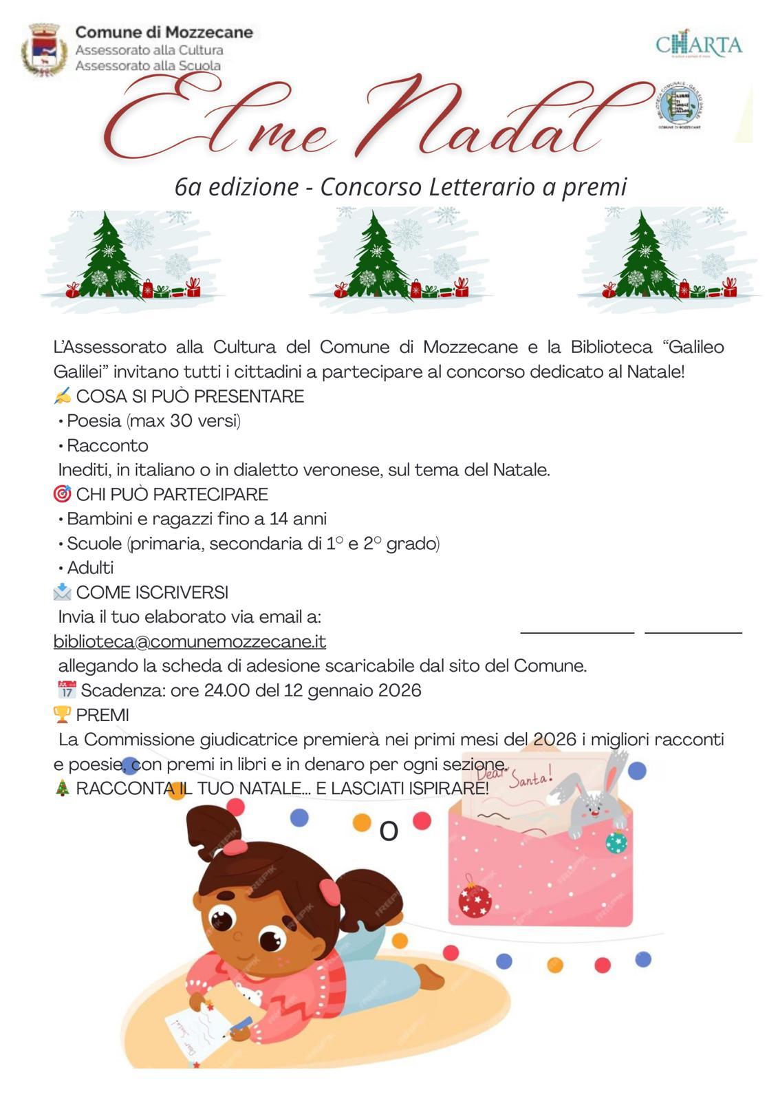 L’Assessorato alla Cultura del Comune di Mozzecane in collaborazione con la Biblioteca “G. Galilei” promuove la 6^ edizione del concorso letterario sul tema natalizio “EL ME NADAL” (IL MIO NATALE).