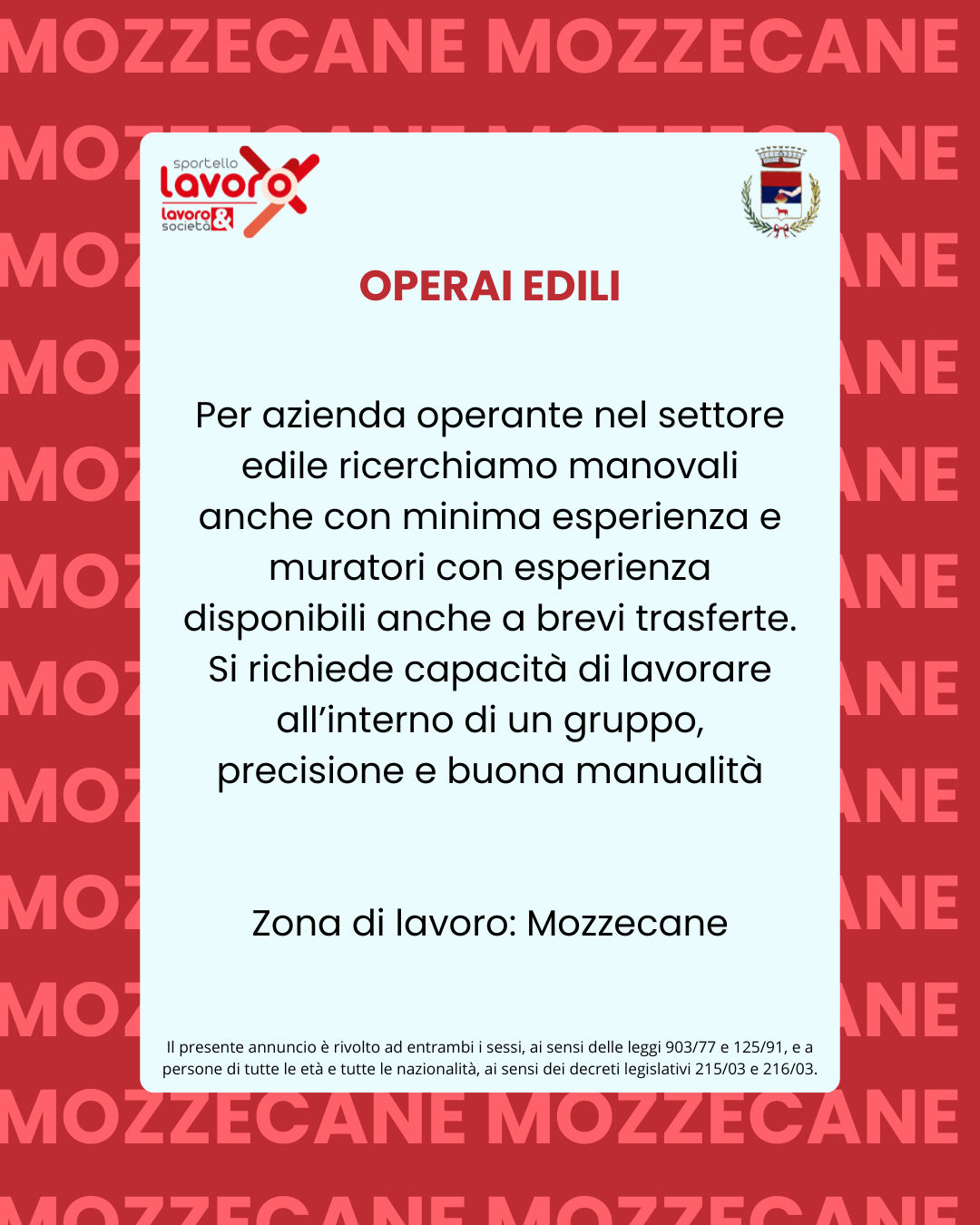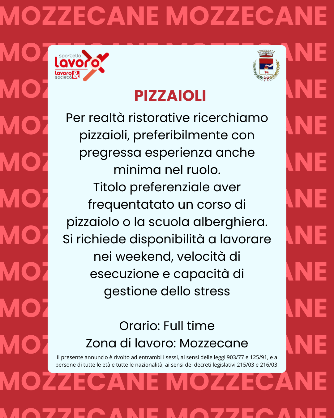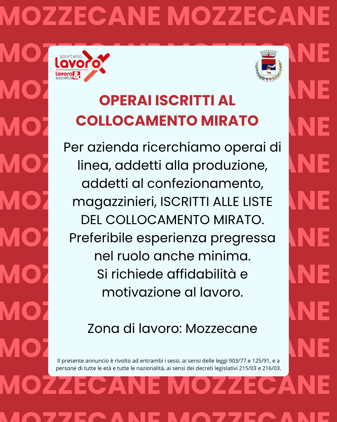 Lo Sportello LAVORO riparte! Gestito da Lavoro & Società – Società Consortile a R.L., realtà con pluriennale esperienza nel campo dei servizi per l’impiego e delle politiche attive del lavoro. A Mozzecane l’operatrice di riferimento è Giorgia Tomelleri, presente ogni martedì dalle ore 14.00 alle ore 18.00 presso la Biblioteca Comunale, in via Carlo Montanari n. 59.